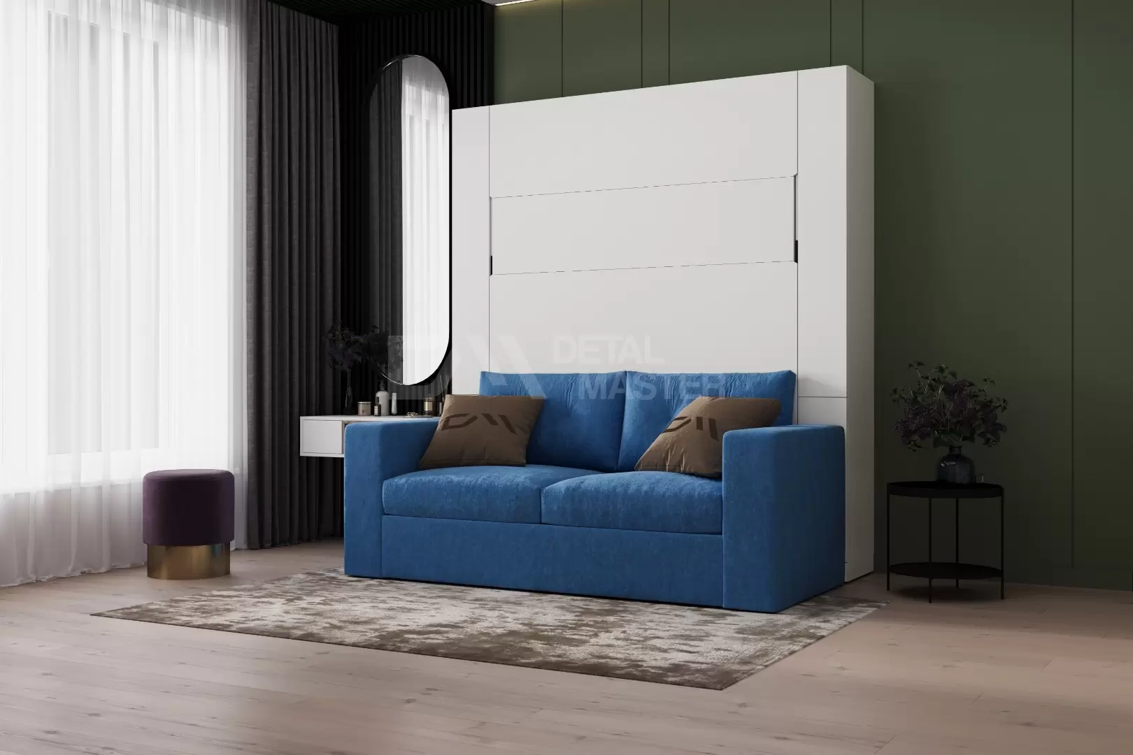 Шкаф-кровать трансформер с диваном " Nova Comfort Balance 2.0." работает на механизме раскладывания собственной разработки "Balance". Кровать раскладывается легким движением руки, превращаясь в полноценное спальное место. Просто потяните за ножку-маятник, которая самостоятельно фиксируется в нужное положение при опускании.